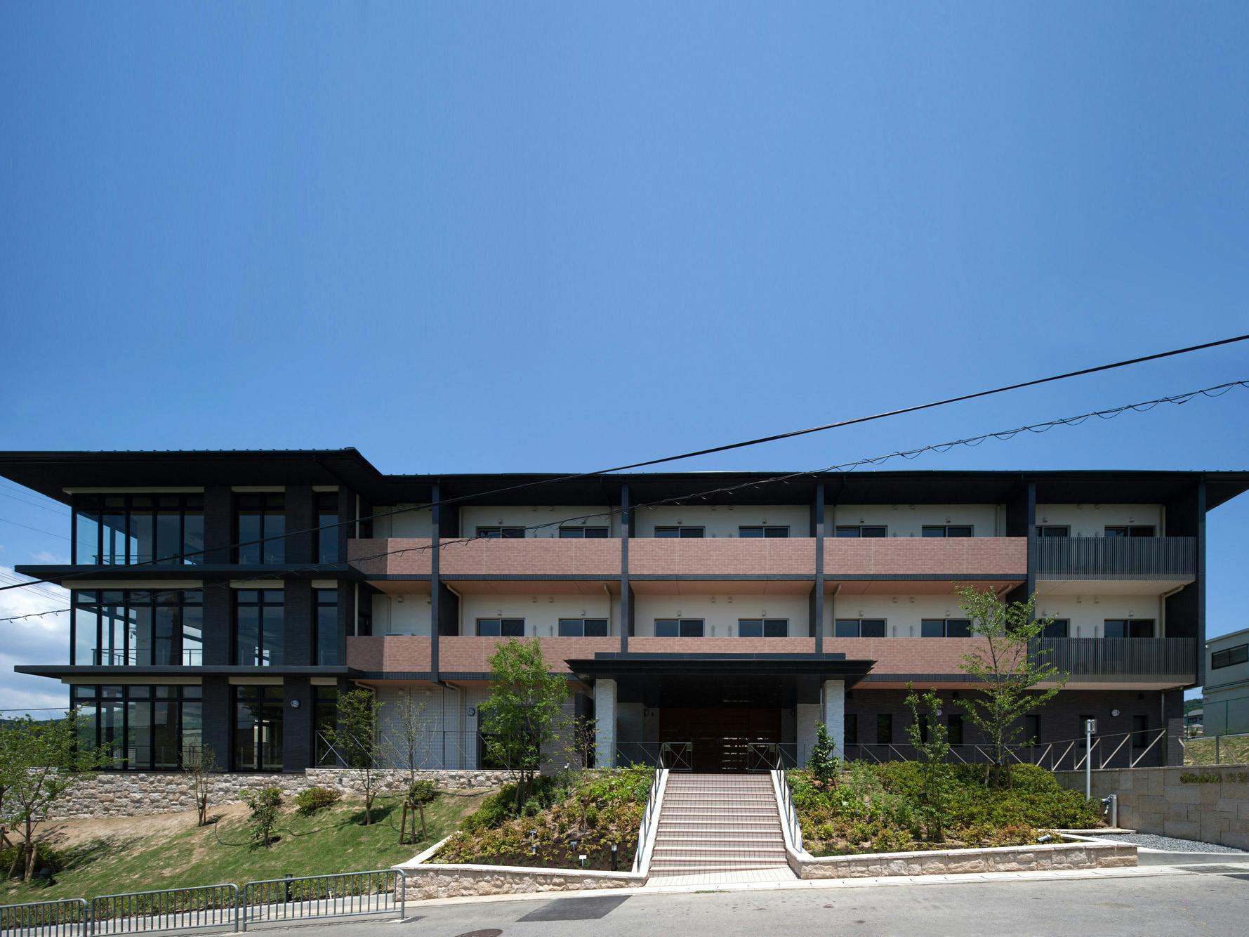 シックな色合いが特徴的な、2階建ての建物です。