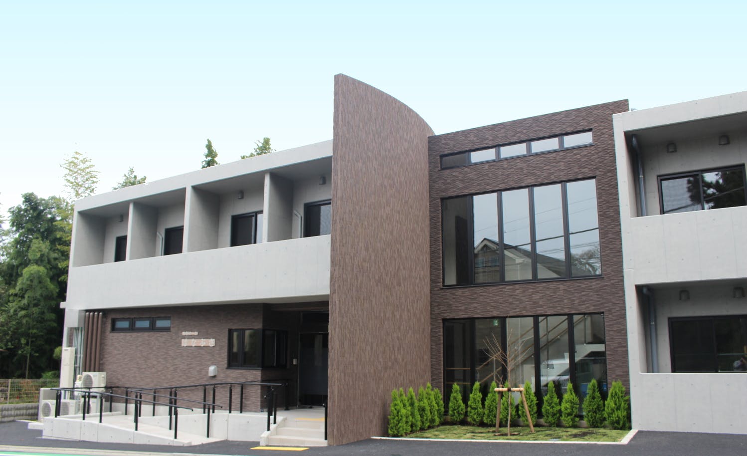 施設内外は新築な装いとなっており、外観は落ち着いた色合いでシックな様相となっています。