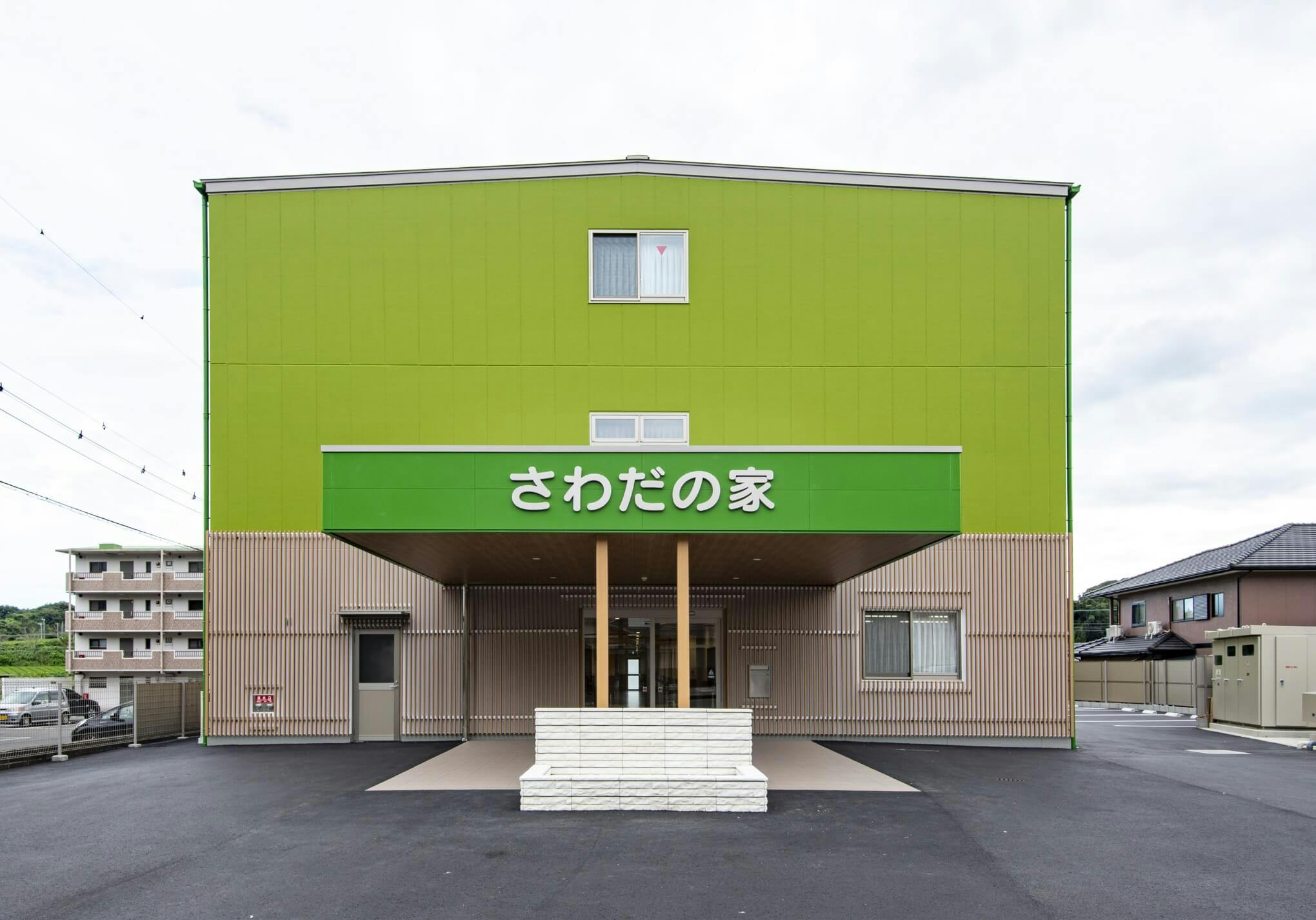 鮮やかなグリーンと優しいライトベージュの外壁が印象的な施設。