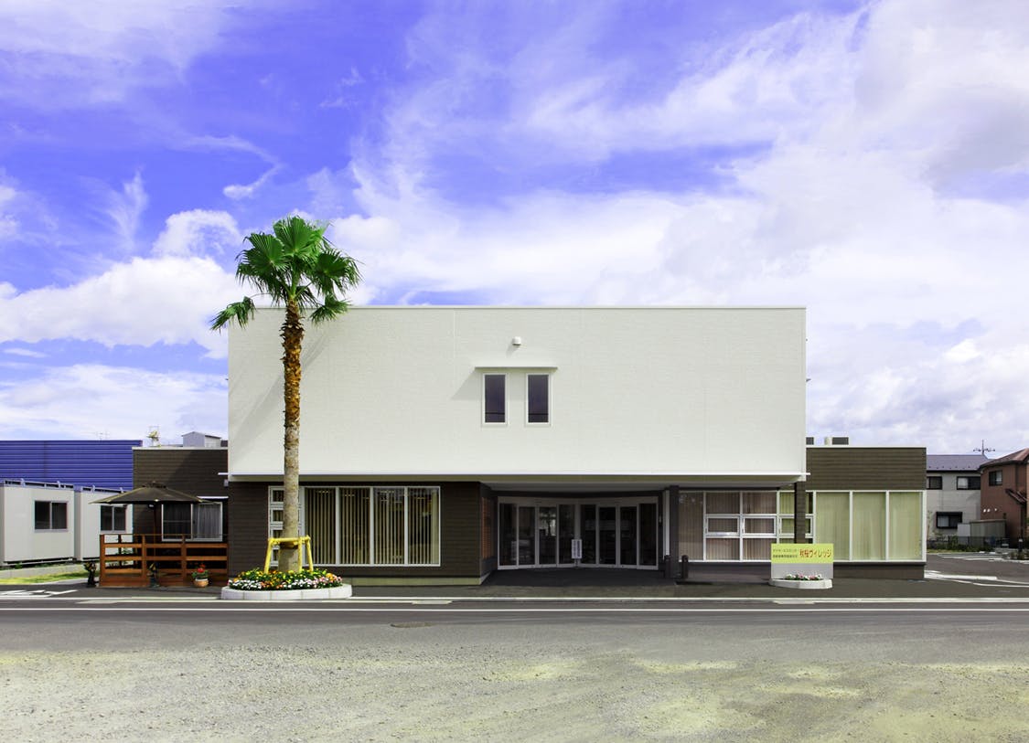 近くに江戸川が流れ、周りには田畑が広がる静かな環境の中で、大きな椰子の木が立つ一際目立つお洒落な白い建物が特徴。
