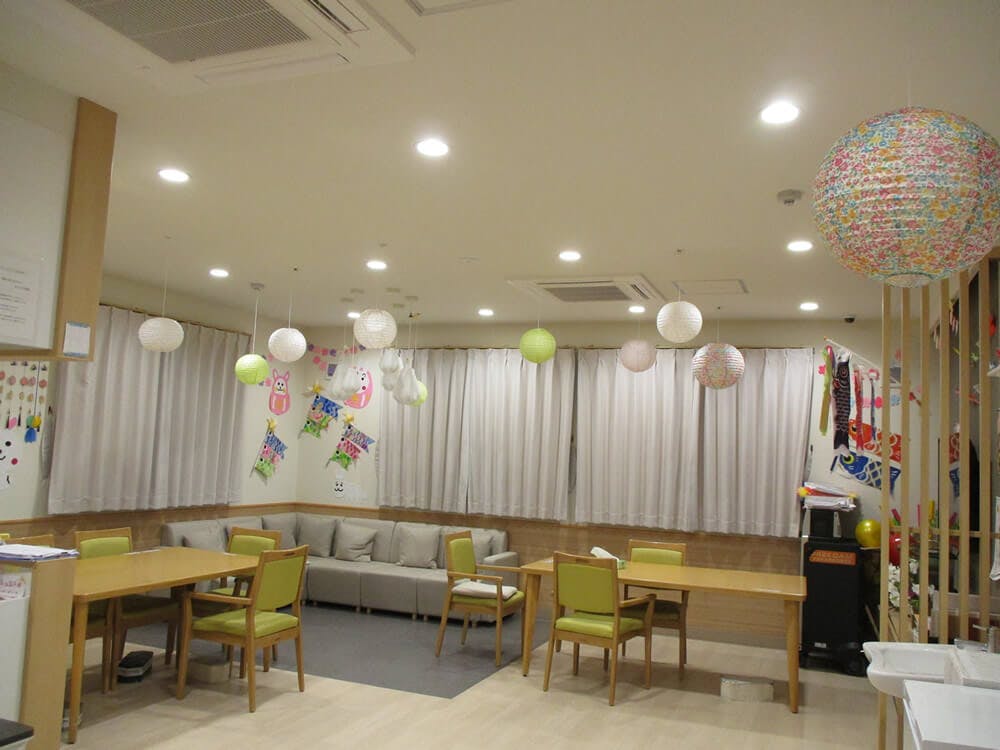 木造造り2階建ての施設は和モダンなデザインが特徴で、室内には陽の光が注ぎ込む明るい空間が広がっています。