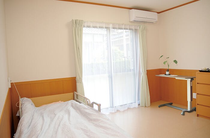 居室は、全室個室でプライベートに配慮されており、エアコン・トイレ・洗面台・電動介護ベッド・ナースコールを完備しています。