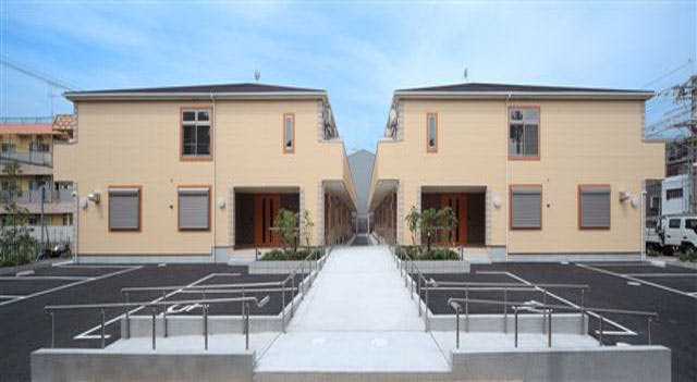 当施設の建物は、明るいベージュの外壁を持つ2階建てで、厳しい国の登録設備基準にもとづき設計・施行された安心の住まい。