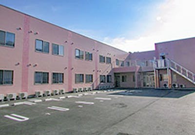 淡いピンク色の外観が特長で、県道105号に面した場所に施設が建てられています。