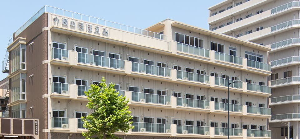鉄骨造の5階建てで、1階はリハビリセンターを併設。