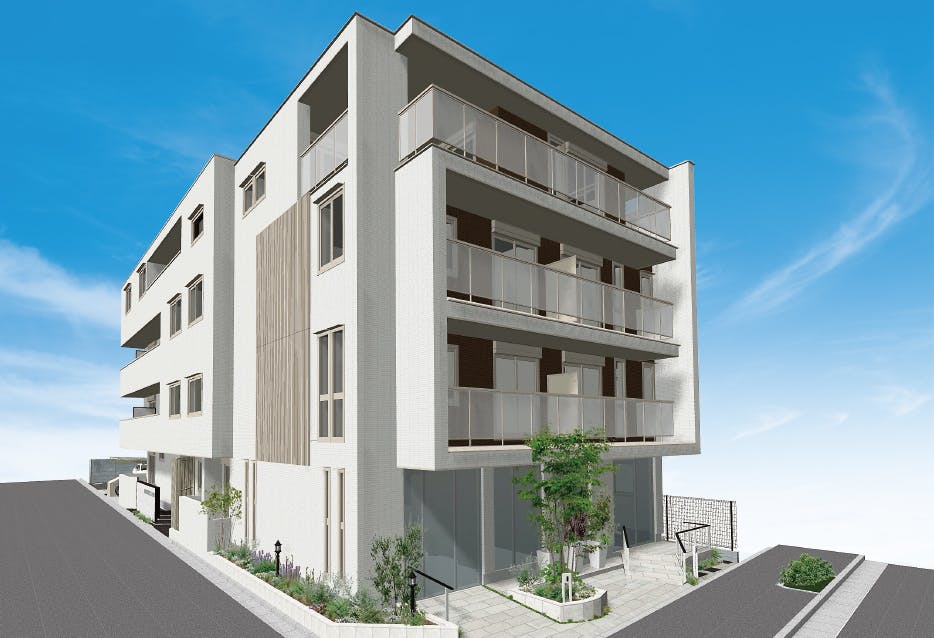 4階建ての重量鉄骨構造を採用する施設は、白い外壁と広々としたバルコニーが目印。