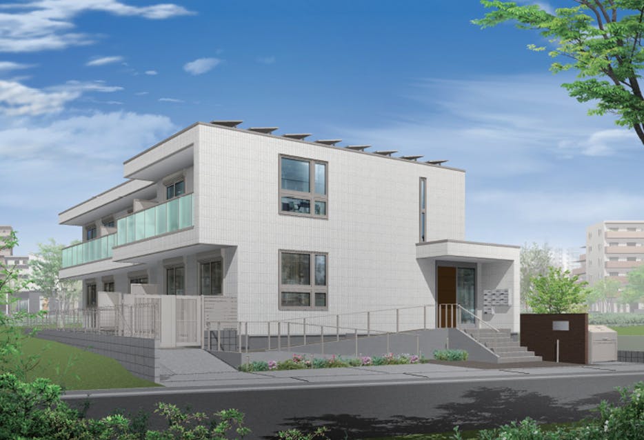 地上2階建ての施設は、広々としたバルコニーとフラットルーフからなるモダンなデザインが目印。