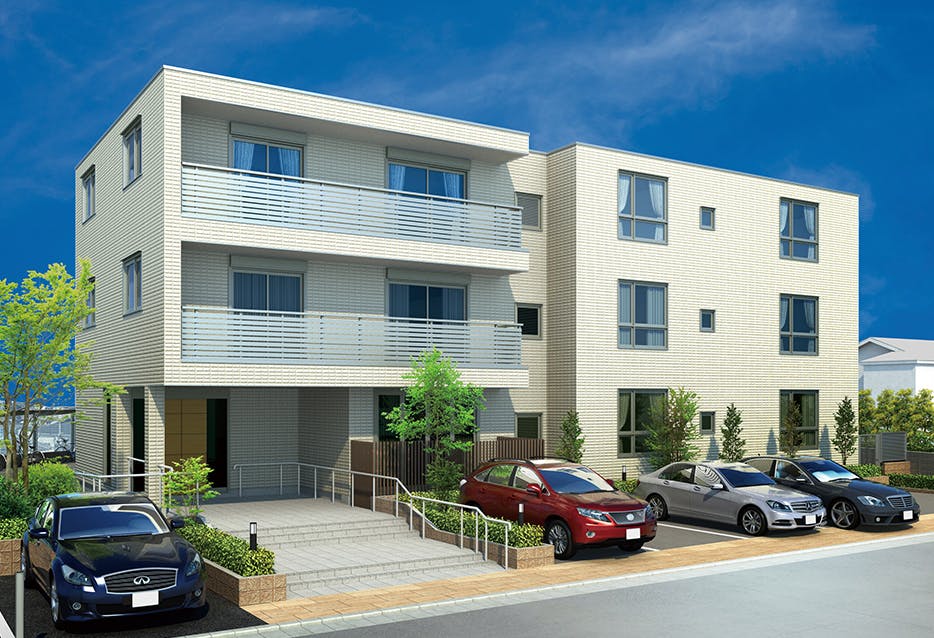 鉄骨ALC造地上3階建ての施設は、白い外壁と広々としたバルコニーが目印。