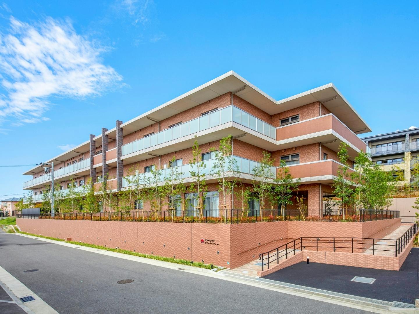 そんな当施設の建物は、明るいブラウンとベージュのレンガ調の外壁を持つ、鉄筋コンクリート造の地上3階建て。