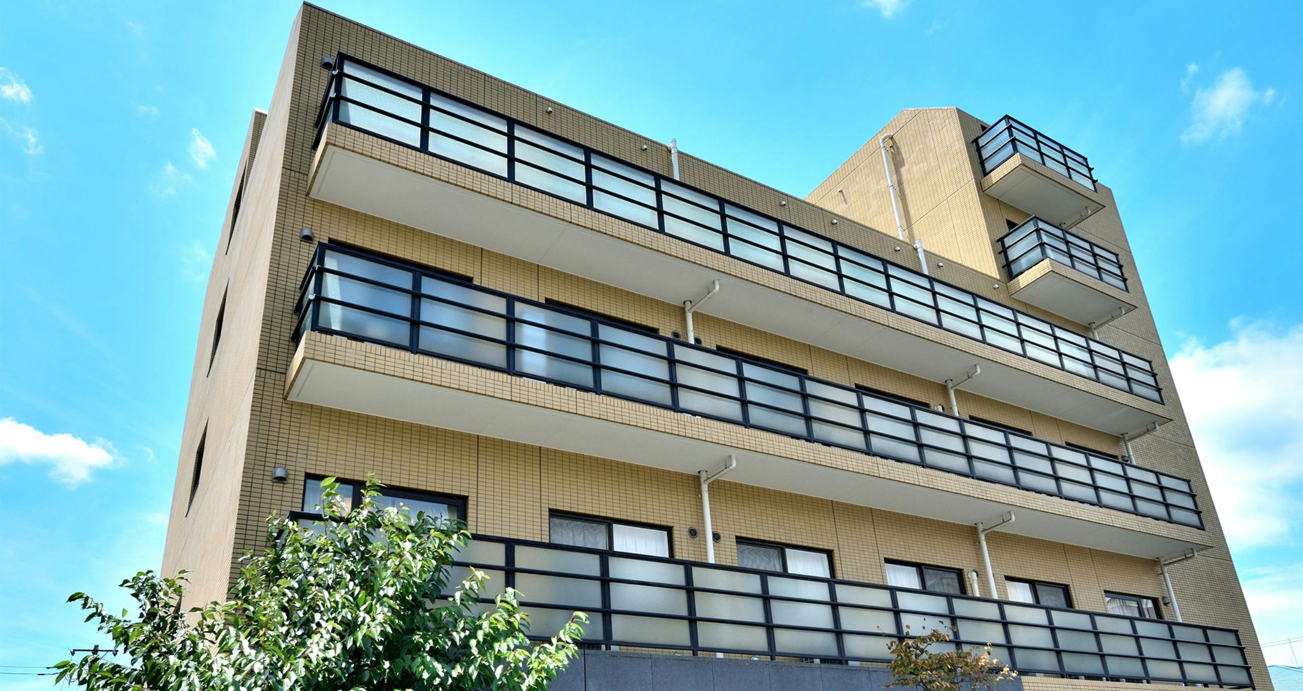 デザイン性のあるベランダの柵や敷地内の樹木などのアクセントでモダンなイメージを喚起させます。