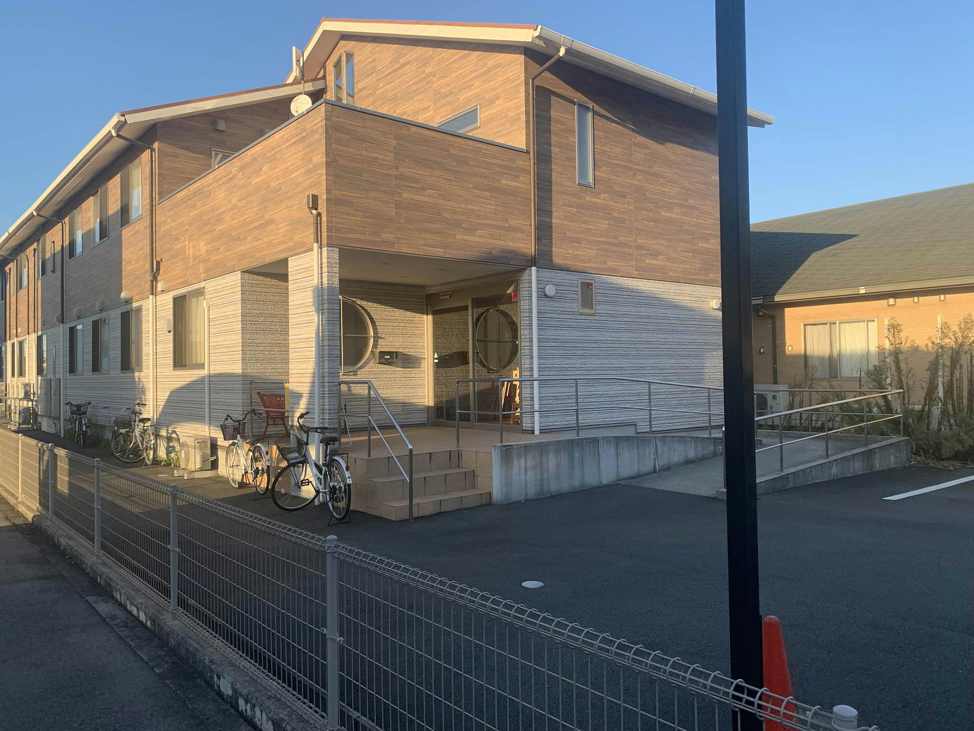 建物は単独型の木造2階建てで、ホーム内は全てバリアフリーに対応しており、玄関までのアプローチにはスロープが設置されています。
