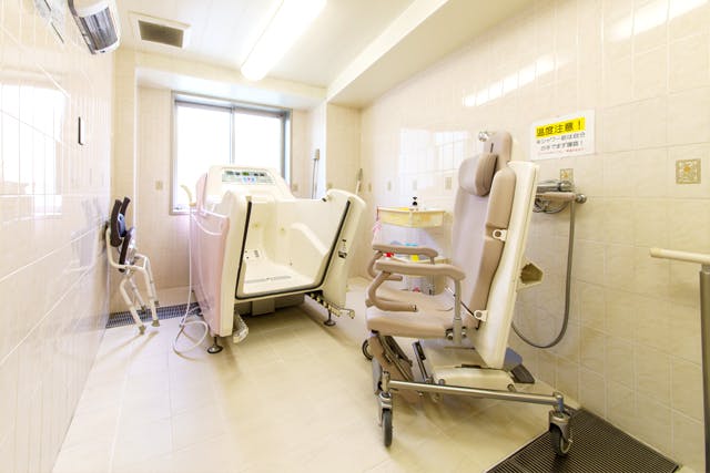 居室内には介護用ベッド、エアコン、カーテンなどが備え付けてあり、入居後すぐに新生活が始められる環境です。共用浴室には機械浴槽を完備。