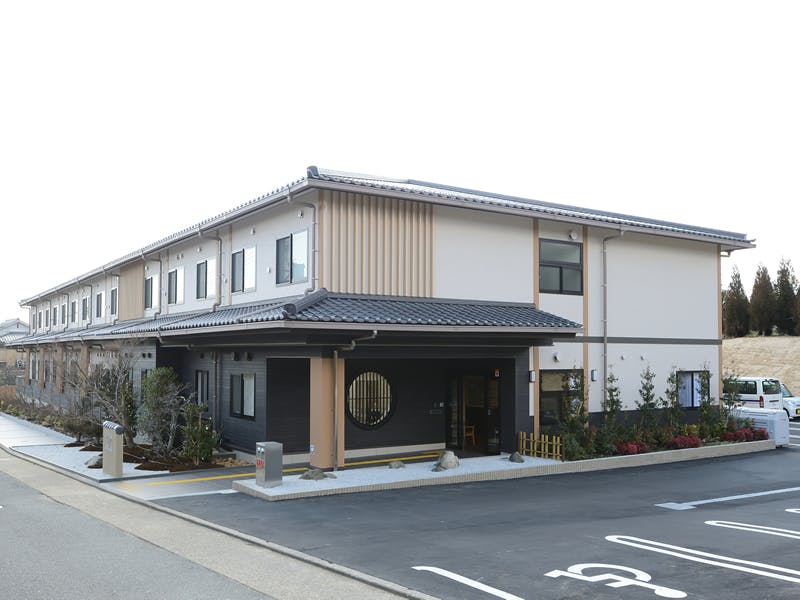 閑静な住宅街に建つ2階建ての施設は、土地の雰囲気に合った和風の存在感ある外観で、定員・居室総数ともに60となっています。