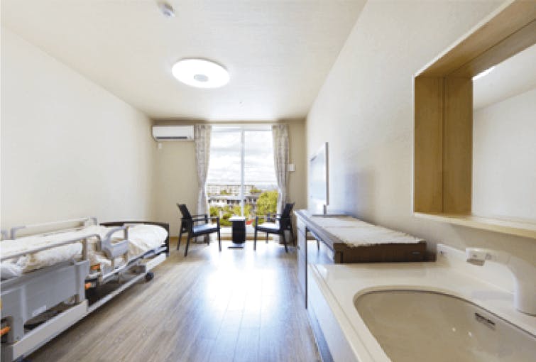 - 居室トイレ付き備え付き家具付き看取り対応可機械浴・特殊浴理容サービス手厚い介護病院併設レクリエーション充実