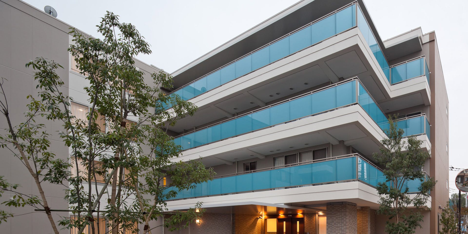 - グレーを基調とした4階建ての建物