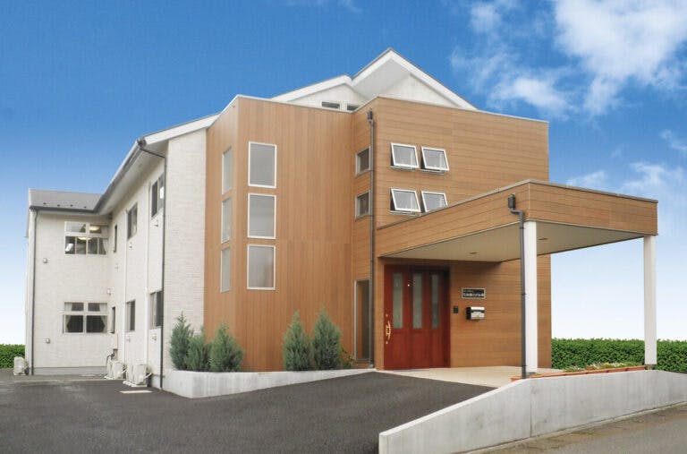 ホームの外観は木目素材とベージュ・ホワイト系の色合いで、大きな一軒家のような温かい印象です。