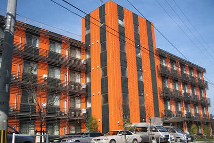 地上5階建ての鉄骨造で、居室には冷暖房・洗面台・トイレ・緊急通報装置・テレビ回線を完備しています。