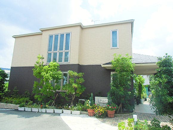 洋風にあしらった建物で、施設の周囲を巡るように緑豊かな庭木が数多く立っている外観が特徴のホームです。