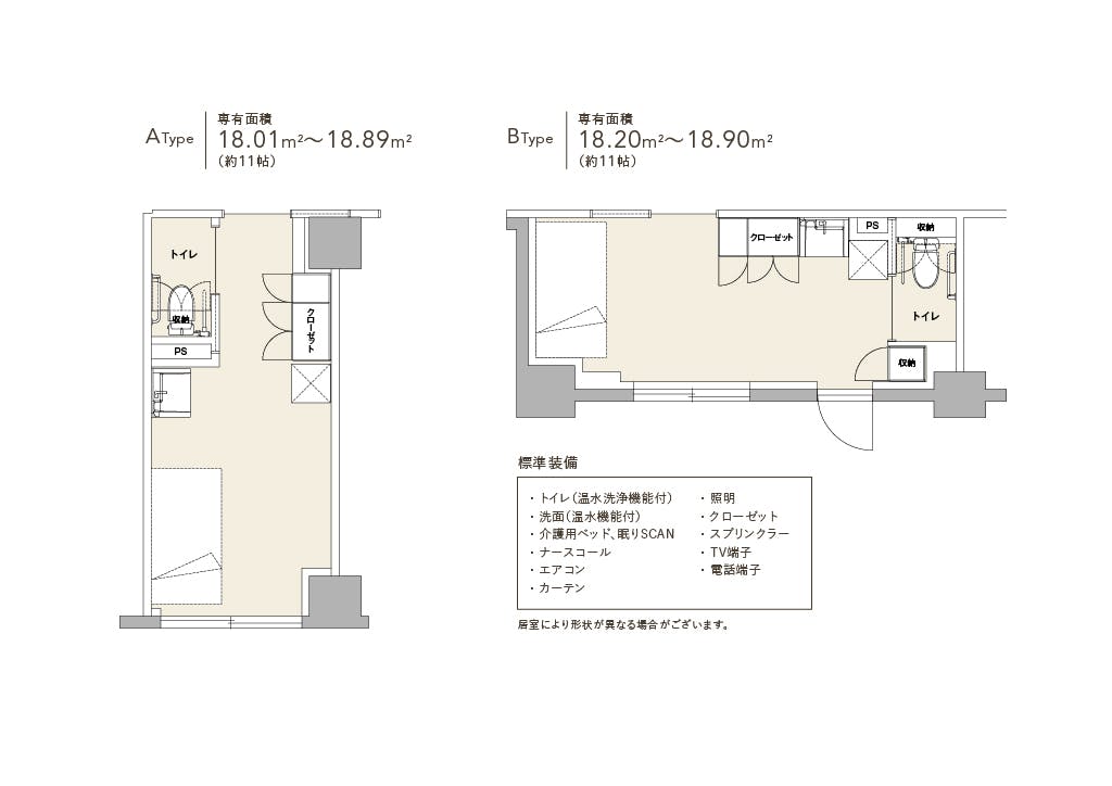トイレ(温水洗浄機能付)、洗面台(温水機能付)、介護用ベッド、眠りSCAN、ナースコール、エアコン、カーテン、照明、クローゼット、スプリンクラー、TV端子、電話端子