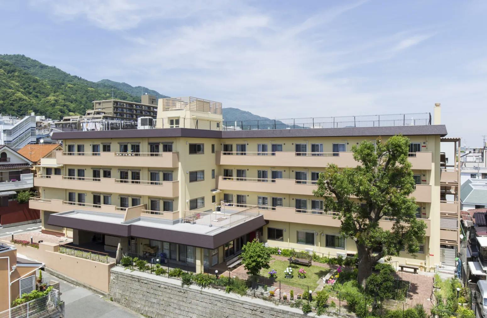 鉄筋造り地上4階・地下1階建ての建物で、クスノキが立つ広々とした中庭や神戸の街と海が一望できる屋上広場など、シニアライフを楽しめる充実した設備が整ったホームです。