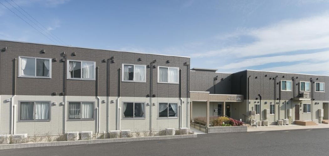 賃貸住宅のような外観の介護施設で、館内は車いすの方もスムーズな移動が可能なバリアフリー構造です。