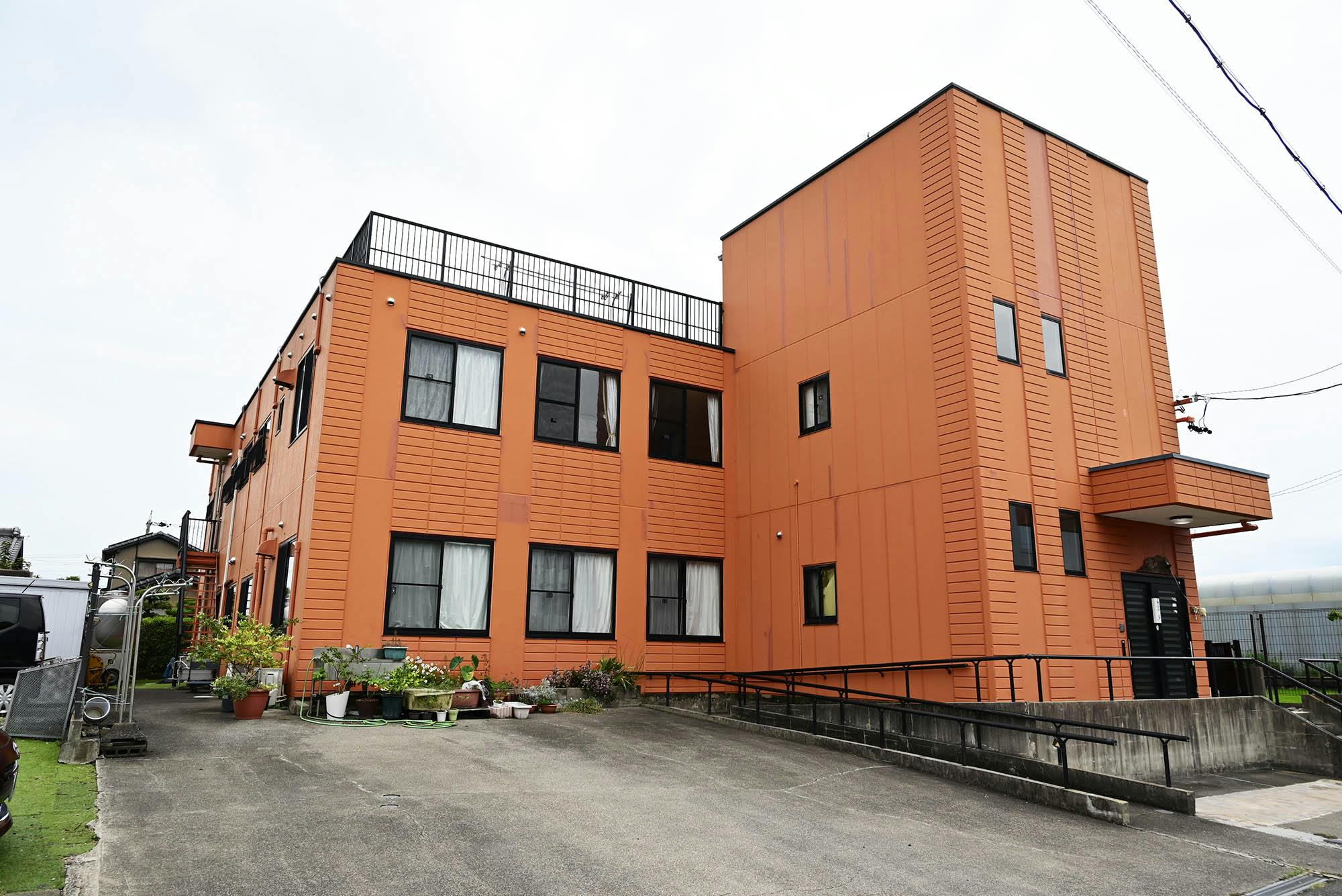 鉄骨造りの3階建ての建物で、玄関にはスロープが設置され、館内には手すりが取り付けられています。