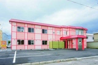 2階建ての木造造りで、ピンク色の外観がかわいらしさを演出しています。