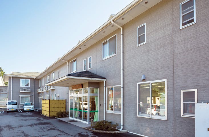 上田市の中心部に近い場所にある介護施設で、ホームの窓から緑豊かな太郎山が一望できる立地です。
