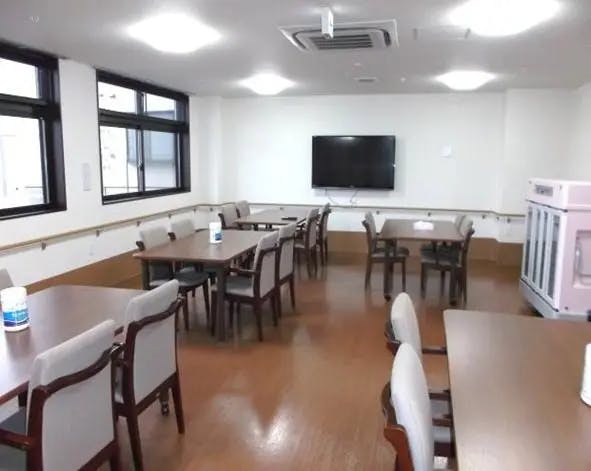 グループホーム導夢は、あおなみ線荒子駅から徒歩1分の場所にあり、交通の便が良く、家族も通いやすい施設です。 周りには商業施設や保育園、住宅があり、利便性も良い環境。 白と青を基調としたモダンな建物で、居宅介護支援や訪問介護事業所が併設されています。 食堂と居間...